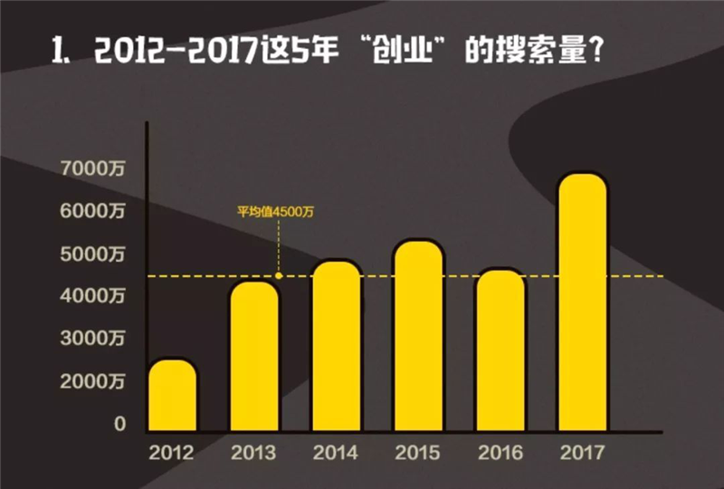 《报告》显示,2012年至2017年这五年期间,“创业”的搜索量呈整体上升趋势,在2017年的搜索量更是超过6000万,以近3倍的数据高于2012年的搜索量。可以看出,随着互联网的高速发展,广大用户对创业的热情与关注愈加高涨。创业正成为一项中国的全民运动。